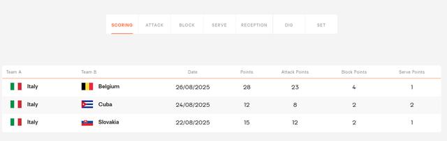 北京时间8月26日,2025年女排世锦赛,意大利女排3-1击败比利时女排豪取三连胜,意大利女排轻松的锁定了B组第一,四局比分:25-16、25-16、21-25、 25-18。这场比赛意大利女排有三人得分上双,比利时女排只有两人得分上双。